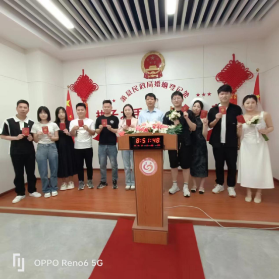 在520这个充满爱意的美好日子里,团县委、县民政局、县妇联、县新时代文明实践推动中心、县总工会、县文联等多家单位联合在该县水墨圣泉古镇凤彩门广场举办了“团聚良缘,情定萧城”萧县第一届青年集体婚礼,14对新人于巍巍凤山和最美红飘带之间,身着华服彩披,面带盈盈笑意,在县直相关单位负责同志和亲朋来宾的见证下,践行“执子之手,与子偕老”的爱情诺言,携手走进婚姻殿堂。现场嘉宾向新人致以诚挚的祝福,向新人亲属致以热烈的祝贺,让新人充分感受婚礼的庄严与神圣、感受到对婚姻的承担与责任。礼成后,新人纷纷在“婚俗改革倡议书”上签名,许下爱的誓言。