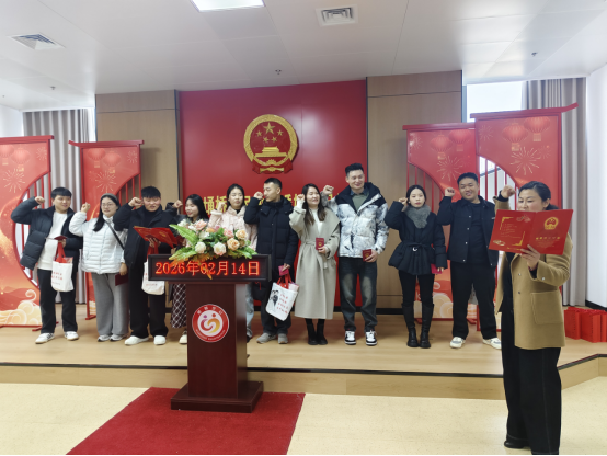 2月14日当天组织新人们举行庄重简约的集体颁证仪式,由婚姻登记处负责人带领新人宣读结婚誓词,并颁发结婚证书。同时,发起“婚事新办 移风易俗”倡议,鼓励新人抵制高额彩礼,践行文明节俭的婚俗新风。
