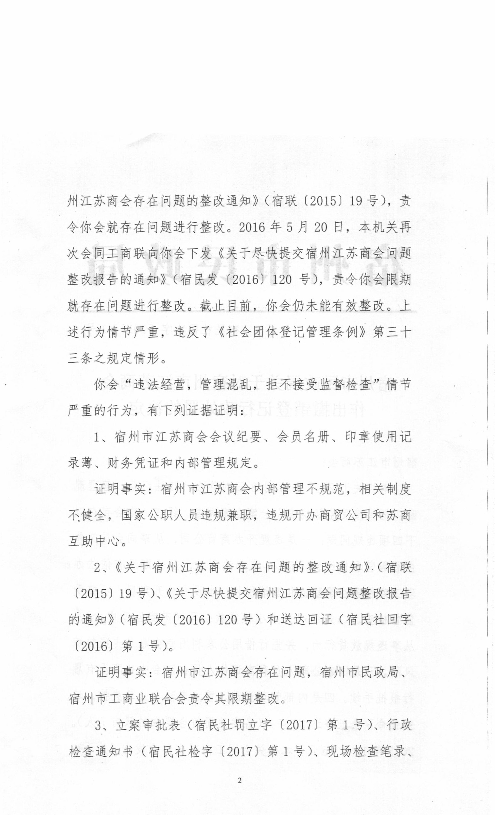 证明事实:宿州市江苏商会存在“违法经营,管理混乱,拒不接受监督检查”问题,宿州市民政局责令限期改正。